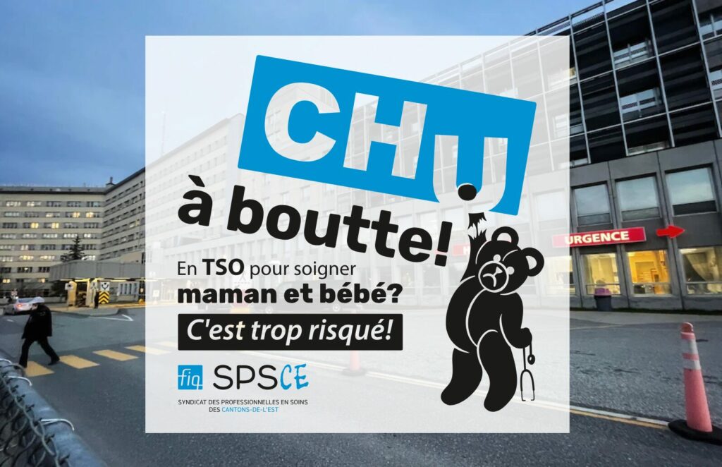 La campagne « CHU à boutte! » a été lancée au printemps 2025 par des professionnelles en soins de la maternité de l’Hôpital Fleurimont. Épuisées par le TSO abusif imposé par leur employeur et après des mois de démarches infructueuses, elles ont commencé à porter un autocollant sur leur uniforme et à apposer quelques affiches pour dénoncer la situation. Rapidement, la direction du CIUSSS de l’Estrie – CHUS s’est opposée à leur campagne de visibilité en tentant tout d’abord de l’encadrer, puis en interdisant toute forme d’affichage et en menaçant l’équipe de sanctions disciplinaires.